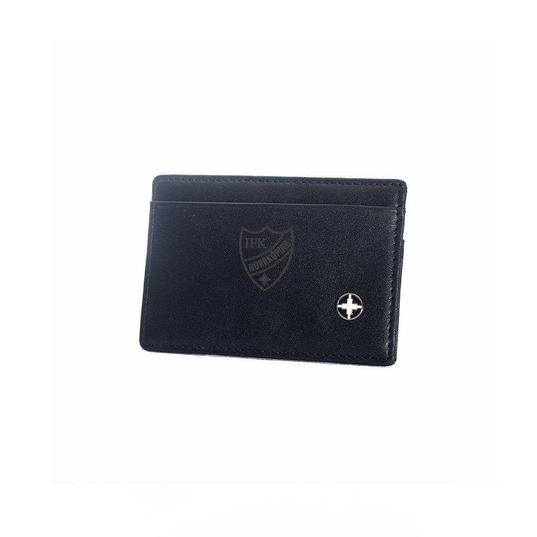 Svart korthållare med IFK-loggan ”ton i ton” på ena sidan.