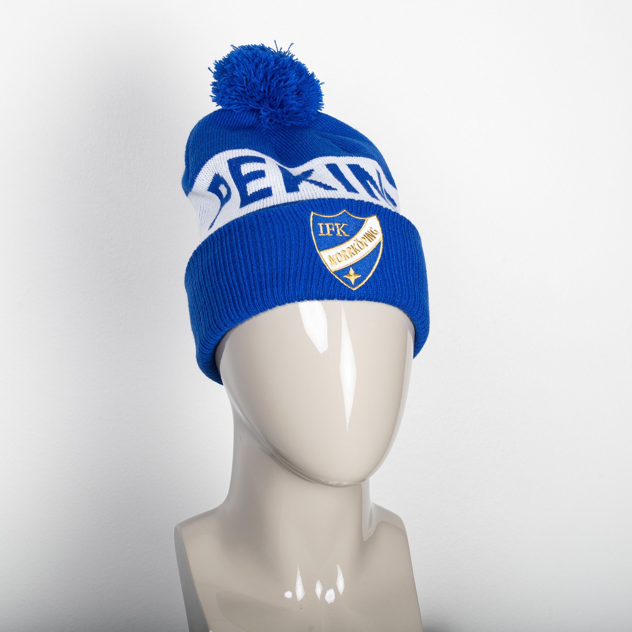Stickad mössa i vitt och blått, med broderat klubbmärke framtill och tofs på huvudet.