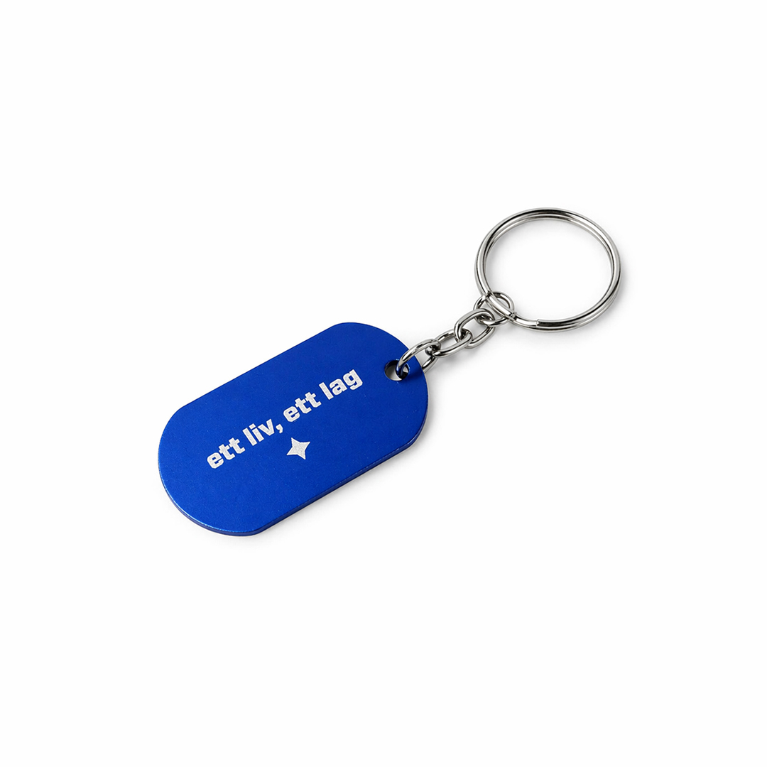 Nyckelring i metall med texten ”ett liv, ett lag”