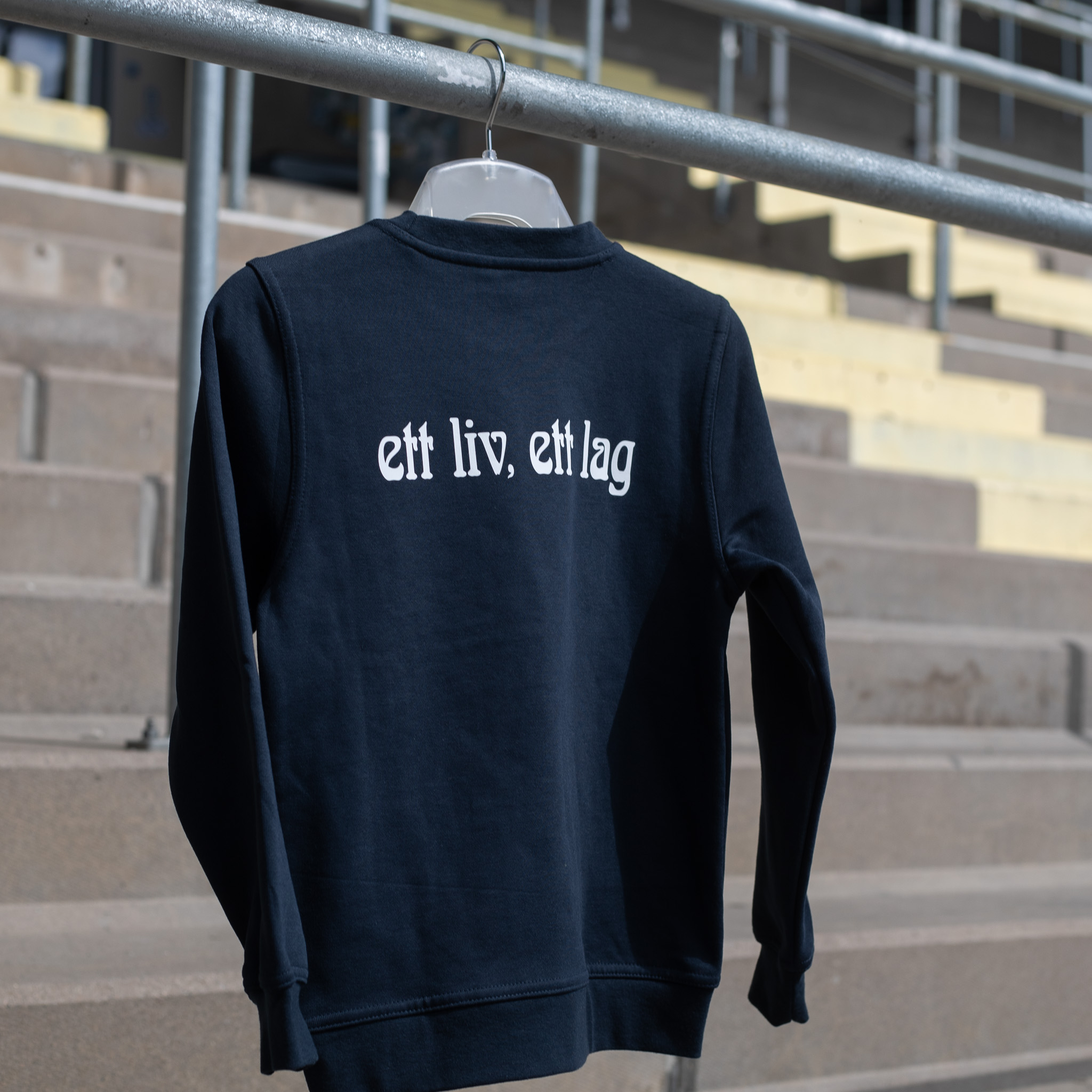 Sweatshirtt med loggan på bröstet samt texten ”ett liv, ett lag” på ryggen